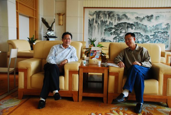 贾崇福(左)同王玉明交谈林业产业发展