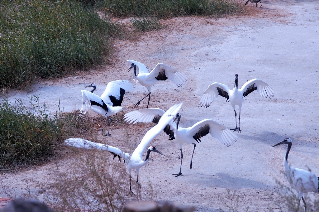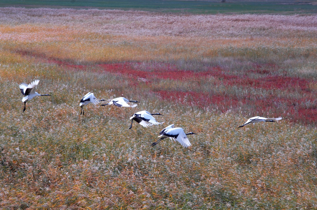 丹顶鹤在芦苇上空飞翔,不忍低飞,似在嗅着苇花的芳香,陶醉向海多彩的金秋。